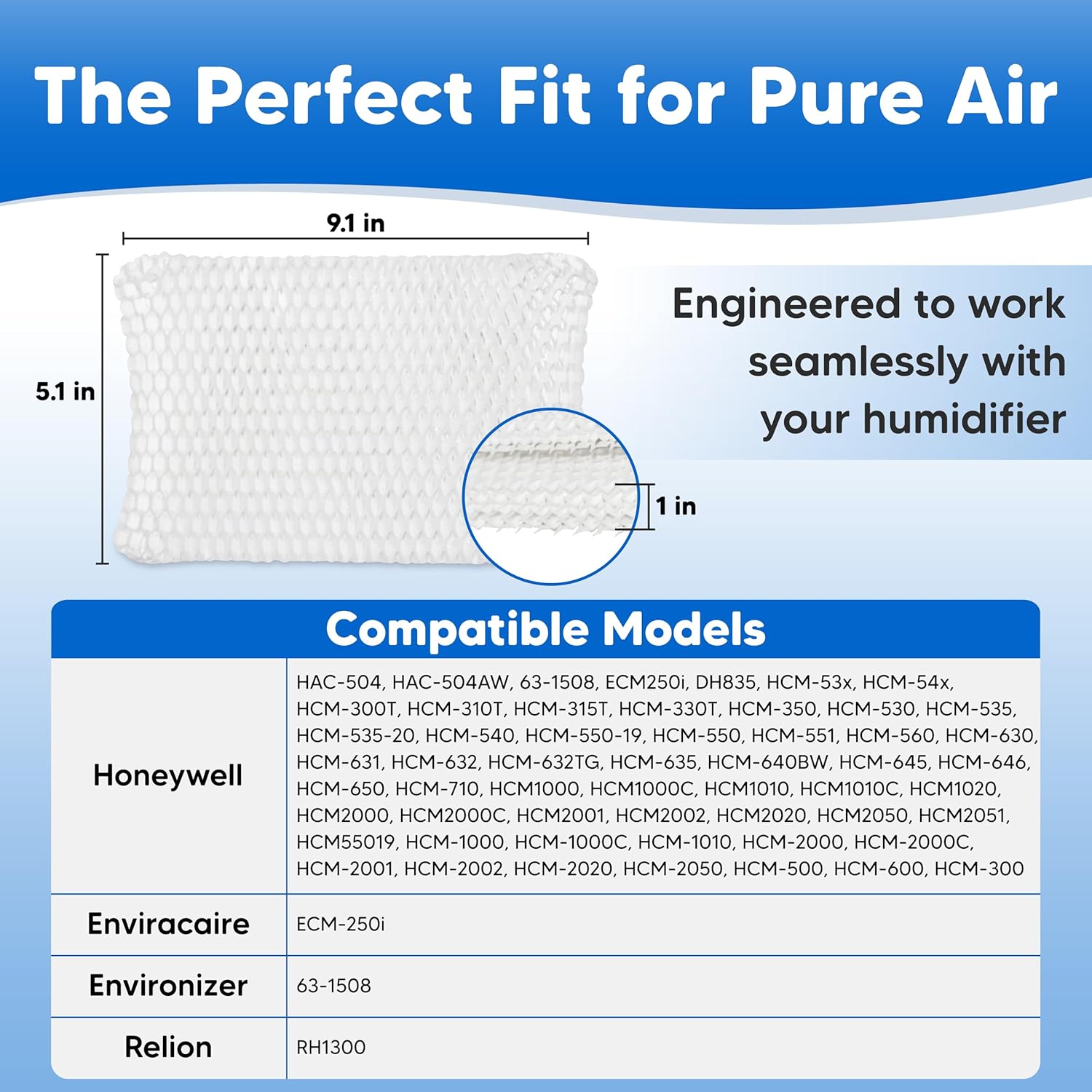 HAC-504AW Evaporative Humidifier Wicking Filter Replacement – Designed as a replacement for Honeywell HAC 504AW filter for use in cool-mist and evaporative humidifiers. This precision-cut wick is a HAC504AW filter, fitting securely to support proper airflow and consistent water absorption.Consistent Moisture Output for Dry Indoor Air – The absorbent paper wicking material distributes water evenly across the filter surface, helping humidifiers maintain steady humidity output. This HAC 504AW replacement filter supports comfortable indoor air during dry seasons caused by heating systems.Designed for Everyday Tap Water Use – This replacement for Honeywell filter HAC 504AW is intended for household use with standard tap water. The wicking structure captures deposits during normal operation, helping maintain proper humidifier function when replaced as recommended.Tool-Free Installation & Routine Maintenance – This drop-in 504AW filter installs easily with no tools required. Pre-soaking before use helps activate wicking performance. Regular replacement is recommended based on water conditions and usage.Ideal for bedrooms, living spaces, and whole-room evaporative humidifiers where reliable humidity output and proper fit are the priority.Please note: This is an aftermarket replacement product and is not an OEM filter. It is not affiliated with or endorsed by Honeywell.