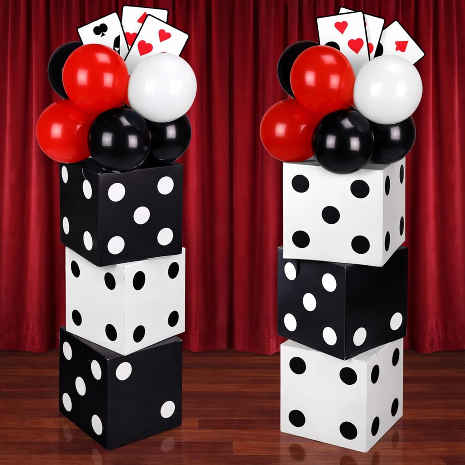 Features: The casino night decorations are lightweight and portable, convenient to carry and store, can be easily moved and placed on the places you like, not easy to break. You can present the casino party decorations as gifts to your families, friends, or colleagues who are about to prepare a casino themed party, offering your help and showing your care. Specifications: Material: Box and card: paper Balloon: latex Color: red, black, white Size: Box: about 11 x 11 x 11 inches/ 28 x 28 x 28 cm Card: about 6.69 x 9.45 inches/ 17 x 24 cm Balloon: about 5 inches and 12 inches Double sided adhesive: about 0.2 inch x 32.81 ft/ 5 mm x 10 m Package includes: 6 x Poker favor boxes 6 x Jumbo poker cards 48 x Red black and white balloons 1 x Double sided adhesive Notes: Manual measurement, please allow slight errors on size. The color may exist a slight difference due to different screen displays.