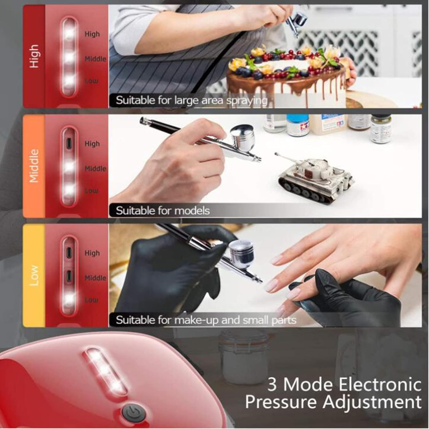 Airbrush compressor kit, double action airbrush combination, airbrush for models, tattoos, manicures, cakes, makeup, paintingSpecificationMaterial: ABS, Copper, AluminumMaximum output pressure: 21psi (MPa)Maximum jet flow: 10.5 (L/min)Best spray distance: 50 (mm)Jet width: 20 (mm)Scope of application: model spray painting, cake spray painting, skin careApplicable scene: homeSuitable capacity: 7cc (ml)RPM: 10.5 L/minAuto Shutdown: 25psiAuto Power On: 15psiWorking pressure: 2~15psiBattery: 1000mahCharging time: 120MinWorking time: 70MinColor box size (CM): 190x150x130Net Weight (KG):1.4Carton size (CM): 635x230x355Carton Net./Gross.(KG): 14/16Notice1. In order to better protect the product and prolong its service life, please use the correct method to clean the spray gun after each use.2. Please make sure the battery is fully charged when using it for the first time. When not in use, please turn off the switch in time to avoid damage to the motor.3. Please read the instruction manual for details.If you have any questions, please feel free to contact us. We will reply to your message within 24 hours