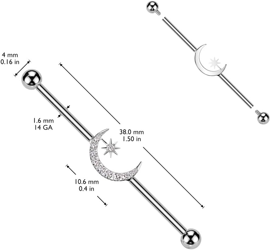 Channel celestial elegance with this enchanting Titanium Internally Threaded CZ Crystal Crescent Moon and Star Industrial Barbell. Crafted from implant-grade titanium, this barbell is corrosion-resistant, hypoallergenic, and perfect for sensitive or healing piercings. The center features a delicately sculpted crescent moon and star design, accented with shimmering cubic zirconia crystals that catch the light with every movement. The internally threaded ends provide a secure and comfortable fit, ensuring easy wear without irritation. Whether you're drawn to moon symbolism or simply want to elevate your ear game with a celestial touch, this industrial barbell combines beauty, comfort, and high-quality craftsmanship in one stellar piece.