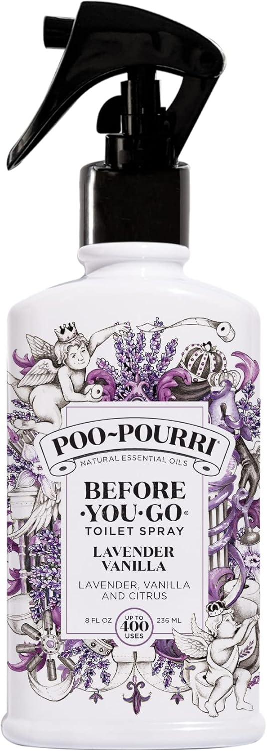 Poo~Pourri Before-You-Go Toilet Spray, Lavender Vanilla Like your nose getting a snuggly hug from your grandma—if she were made of pure lavender. Add warm vanilla and woodsy eucalyptus, and suddenly you’re nose-deep in a vanilla bath in the middle of a lavender field… not on a toilet. Literal heaven. Poo~pourri freshens bathroom odors before it begins by creating a barrier on the surface of the water—so you can leave the porcelain throne smelling better than you found it. Contains no harsh ingredients. No parabens, phthalates, aerosols or formaldehyde.. Never run out of your favorite Poo~Pourri scent. Each bottle delivers up to 800 uses. Easily refills. Just give it a good shake. Lift cap and pour in and and let the Funk-Lock Technology work to create a barrier on the water’s surface. It helps keep unpleasant smells contained and leaves the space lightly scented. Suitable for everyday use or as a thoughtful gift, Poo~Pourri also works in other odor zones—think diaper pails, trash bins, or laundry rooms. So go ahead—use it before you go, wherever you go!