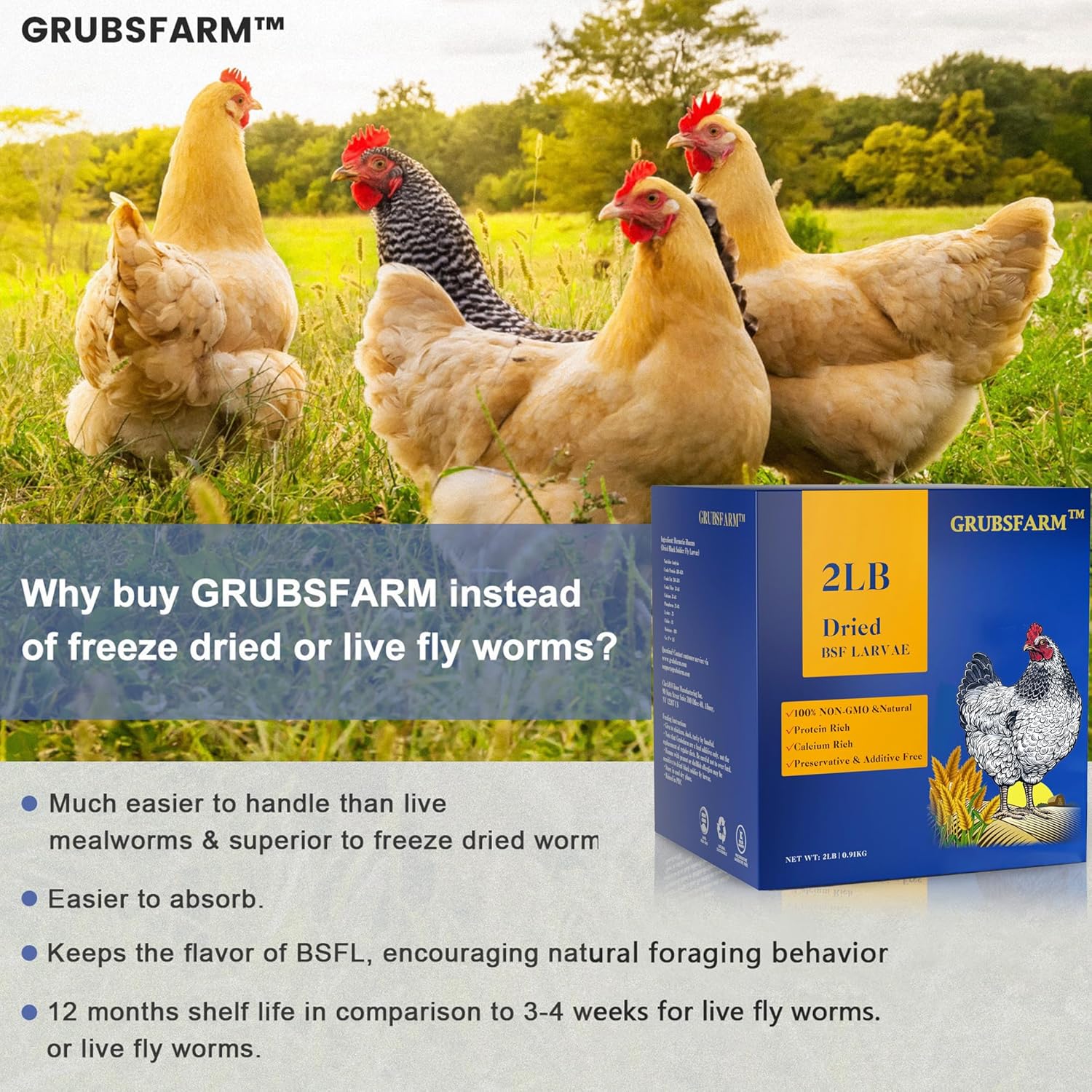 GRUBSFARM not only promotes stronger eggshells and healthier feathers but minimizes the protein feed and calcium supplements costs. My cost per dozen of eggs is at or around $0.8. Hoping to get it down to $0.50 if I can free range them. It's a smart investment. — Bonnie S. Kruse, Chicken Keeper from Florida. GRUBSFARM non-GMO black soldier fly larvae for chickens is all about helping you have a happy, healthy flock of egg-laying’ ladies. We raise fly grubs on farms in China and cooperate with college professors to improve the methods of producing and processing grubs. It's also why we can offer high quality but affordable BSFL in the US. We closely monitor each phase of the BSF lifecycle, thus we could ensure the BSF larvae quality and consistency, and follow strict American regulatory standards. Everything your funny feathered friends love and need to bring an abundance of joy & eggs to you and your family every day.【PLEASE kindly note that "Made in the USA" tag is just a marketing ploy】 - GRUBSFARM are all-natural, protein-rich and calcium-rich balanced treats. These fly worms support strong and healthy growth, help prevent egg deformation and promote stronger eggshells & healthier feathers & speed up the molting process. In conventional feeds, chicken protein feed is obtained mainly from soybean and fish meal (SFM). Bonnie replaced 45% SFM with GRUBSFARM in her laying hens’ daily diets. She was able to achieve a 16.0% higher Cost Benefit Ratio and 25.0% better Return on Investment when the birds were reared on this ratio of our grubs compared to the original conventional diet.