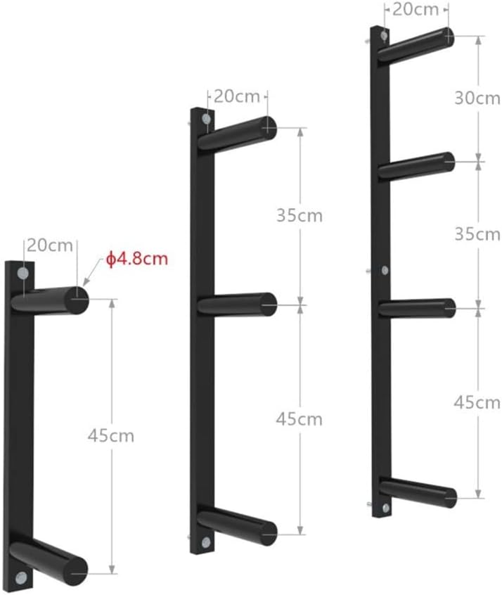 Welcome to my store. Multi-Plate placement- Weight Plate Rack Hanging rod with a diameter of 50mm and a length of 20cm, hangs a standard 50mm barbell, which can be stored in multiple pieces Multi-jack storage- 2" Barbell Weight Bar (A, B, C, G) name: wall mount pole socket (D, E, F) name: vertical barbell rack Model: Double cylinder, four cylinder, single cylinder, three cylinder Material: high-quality steel (surface anti-rust electrostatic spraying process) Color: matte black Specification: 50mm in the insert barrel Installation: expansion screw wall mounting Function: Barbell bar insertion