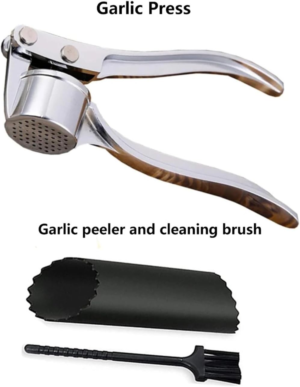 Fit for Your Kitchen with Ultimate Tired of tedious, sticky garlic prep? Our all-in-one kitchen toolset is designed to the hassle, transforming garlic and ginger preparation from a chore into a quick, clean, and enjoyable part of cooking.Designed for Practicality and Performance:The cornerstone of this set is our heavy-duty stainless steel press. Its robust lever mechanism and precision-designed holes allow you to mince garlic or grate ginger with smooth, minimal pressure. Forget about tedious peeling—simply place whole garlic cloves inside the flexible silicone peeler tube, roll it under your palm, and watch the skins separate magically, leaving your hands clean and odor-free.Built to Endure Your Daily Cooking:We believe tools should work for you, year after year. The solid stainless steel construction ensures this press won’t bend, rust, or retain food odors and flavors. It’s a reliable, hygienic companion for all your recipes, from hearty pasta sauces to delicate salad dressings.Maintenance:We understand that easy cleanup is non-negotiable. After use, simply use the provided bristle brush to clear the mincing holes in seconds. For a deeper clean, the main press component is dishwasher safe, offering you ultimate convenience.Your Complete Preparation Solution:This isn’t just a single tool; it’s a thoughtful kitchen system. By combining a professional-grade press, a genius peeling tube, and an essential cleaning brush, we provide a holistic solution that addresses every step of the process. It’s the smart, organized, and practical choice for modern kitchen.