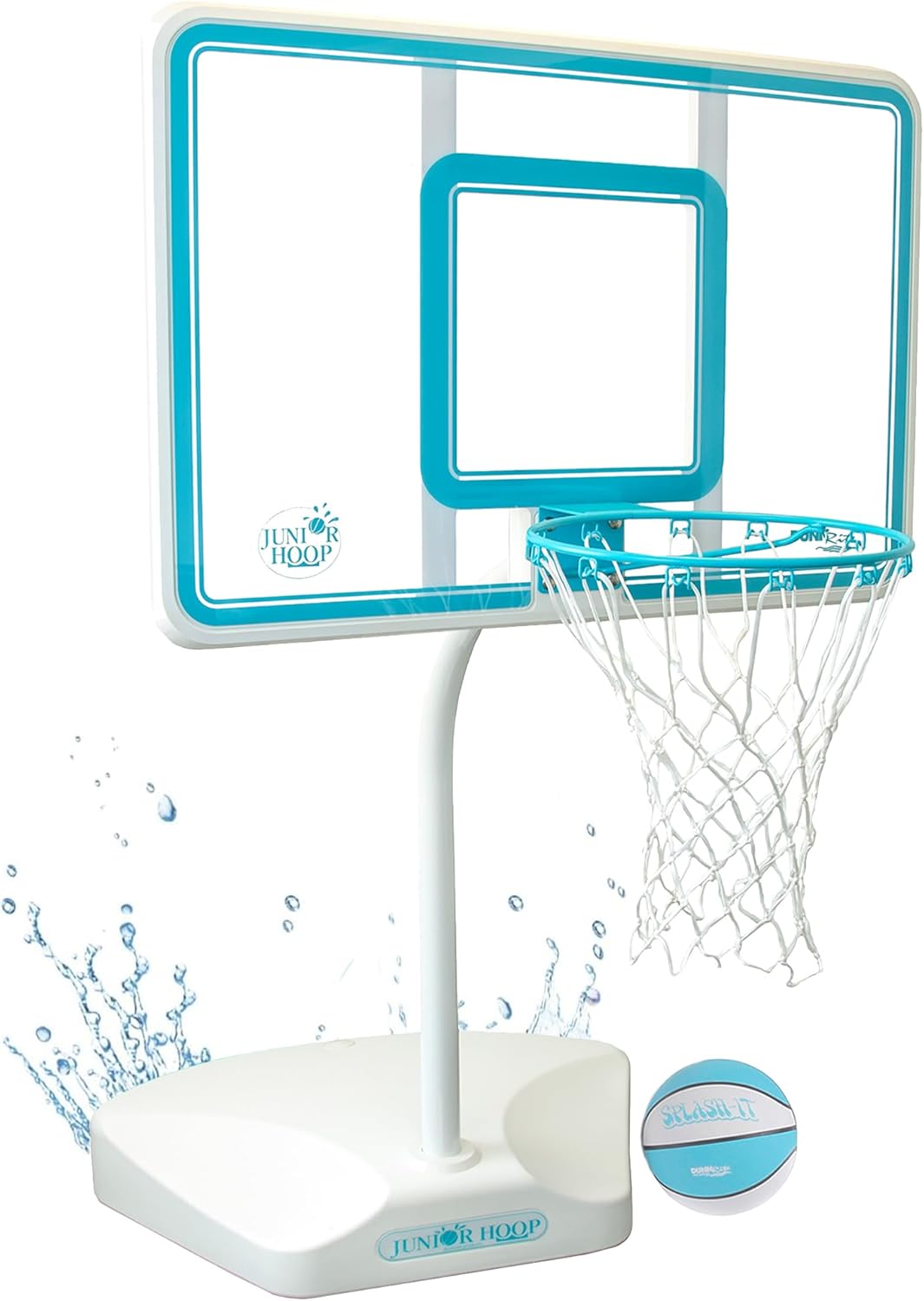 Choose a white or clear pool basketball backboard with a vinyl coated 14” stainless steel rim. The 1.90-inch aluminum post is bent to produce 12 of overhang, keeping play away from the pool’s edge. Water filled poly base weighs 110lbs when filled with water. The rim is fixed at 39 inches above the decking. Comes complete with a mid-sized color matched water basketball, stainless steel hardware and net. Unit comes with a one-year three-year warranty.