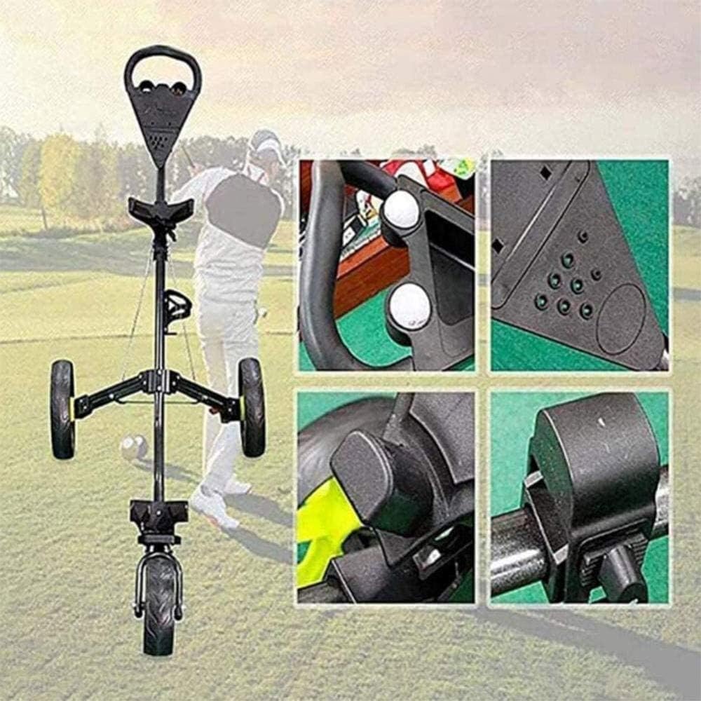 Golf carts, ideal golf accessories for men and women. Suitable for golf carts, golf cart accessories and men's and women's golf clubs, this foldable golf cart is also equipped with a ball wheel, which can run smoothly on any terrain. Just gently pull to engage and release.Material: Aluminum Alloy, AbsDiagonal Length: 165 cmWheel Diameter: 27 cmHeight : 102 cmWeight: 5.5 KgLoad Bearing: 50 KgFeatures:This Foldable 3 Wheels Golf Trolley, Which is Perfect for Golf Exercising. It Allows You to Transport Golf to Clubs or Golf Courses.
