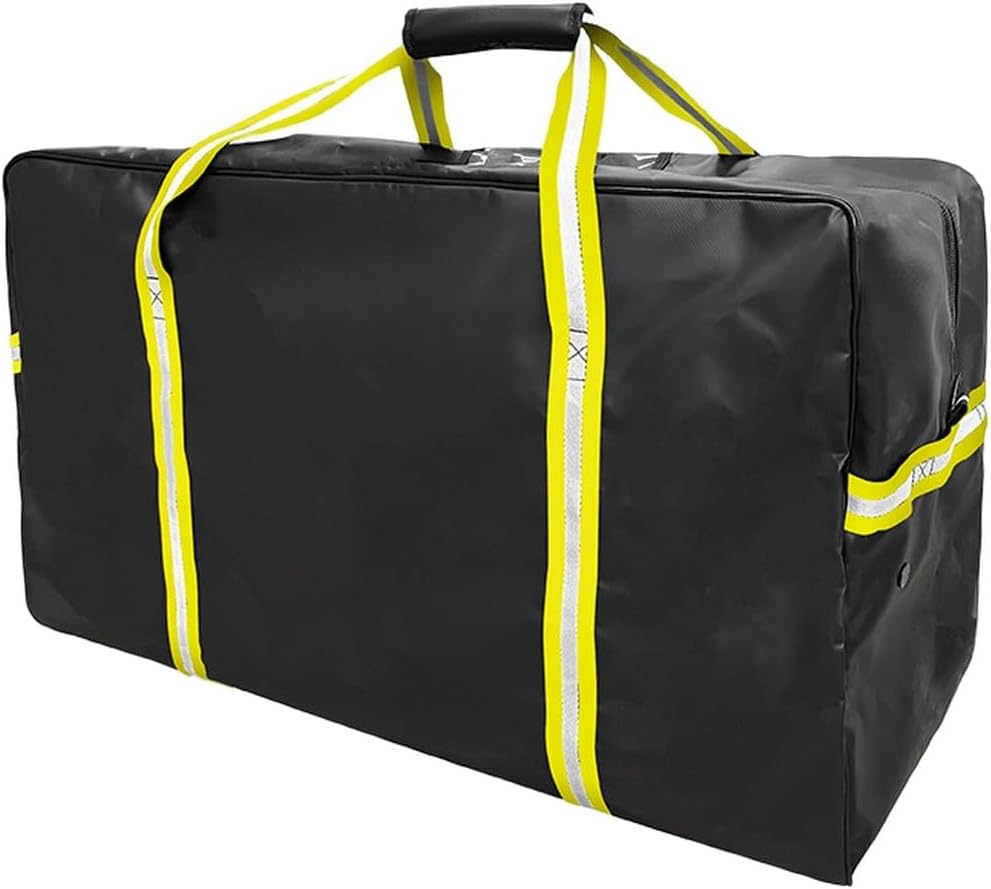 Features: * This heavy-duty ice hockey equipment bag boasts a spacious 78 x 41 x 36 cm (30.7 x 16.1 x 14.2 in) capacity to hold skates, protective gear, gloves, and a helmet, meeting the needs of training and games.* The durability, waterproof PVC mesh reinforced fabric (PVC tarpaulin) effectively protects your hockey equipment bag from rain, mud, and rink splashes.* The perforated design enhances airflow, helping equipment dry faster and reducing smell after intense training, games, and travel.* An internal pocket holds small items such as tape, shoelaces, mouthguards, or keys; keeping your hockey equipment bag organized allows you to focus on the rink without the hassle of searching for odds and ends.* This heavy-duty ice hockey equipment bag is easy to wipe clean and is ideal for rink training, gym workouts, or travel, providing proper protection for your equipment between training session and the season.Specifications:* Product Name: Heavy Duty Ice Hockey Equipment Bag* Material: PVC* Size: approx.78 x 41 x 36 cm (30.7 x 16.1 x 14.2 in)*Color: black*Weight: about 1400gPackage Content:1 x Hockey Equipment Bag