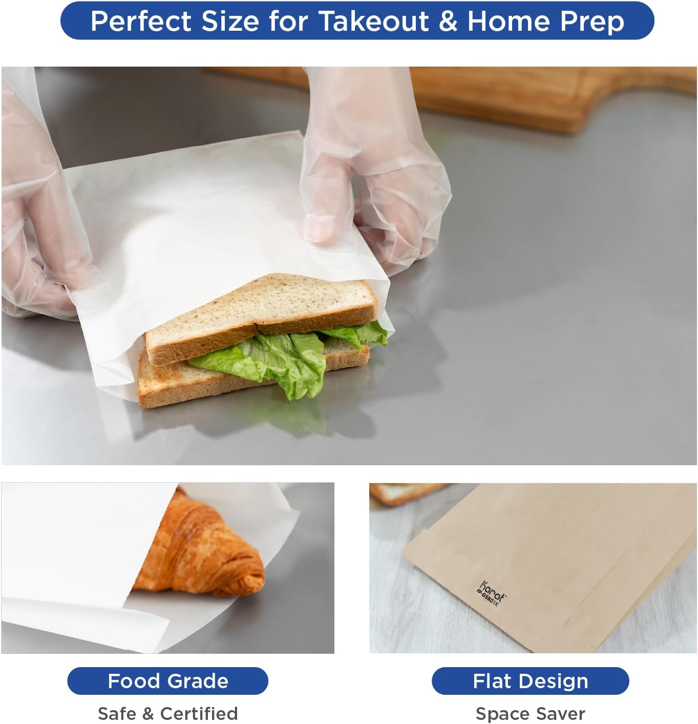 Karat innovative solution for your food storage needs - the grease-resistant paper sandwich bags. These bags are perfect for sandwiches, snacks, and more, making them a must-have for your kitchen. These paper sandwich bags are not only practical but also eco-friendly. They are recyclable, PFAs Free, and BPA Free, making them an excellent choice for those conscious about their environmental impact.With their easy-to-open design, these bags are incredibly user-friendly. They also boast a flat-storage design for easy and convenient storage. Featuring a leak-resistant property, these bags ensure that your food stays secure, preventing any unwanted spills or messes. The Karat logo printed on the back of the bag adds a touch of sophistication and assures you of its quality. Whether you're packing lunch for work, school, or a picnic, these paper sandwich bags are the perfect companion for your meals on the go. Choose Karat's brown paper sandwich bags for a reliable and eco-friendly solution to your food storage needs.
