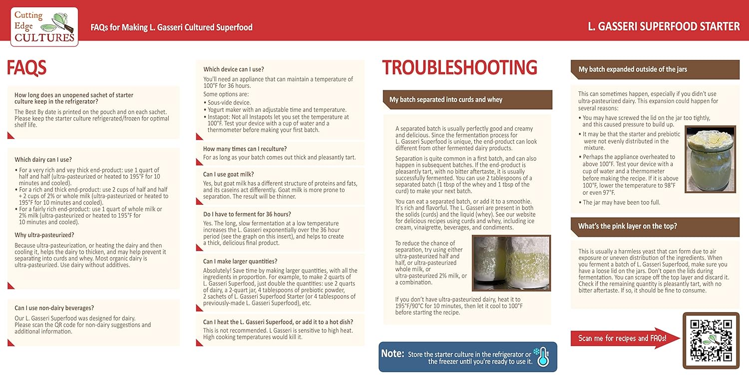 Lactobacillus Gasseri (L. Gasseri), AKA “The SUPER MICROBE” is one of the most important gastrointestinal (GI) microbes in the human intestinal microbiome. likely a “keystone” species that is important for the proliferation and metabolism of numerous other microbes*. Our L. Gasseri Superfood Starter was conceived as a method of introducing high quantities of this beneficial microbe into your microbiome. L. Gasseri Superfood may look, taste, and smell like yogurt, but it is not a yogurt. It is cultured dairy, made with completely different strains of bacteria = Lactobacillus Gasseri. The fermentation process is different from that of conventional yogurts: It is fermented for 36 hours at a lower temperature and requires the addition of prebiotic fiber to the milk.method enables the L. Gasseri to proliferate exponentially many times over, until there are hundreds of billions of live bacteria in the jar. The resulting concentrations of L. Gasseri are much higher than can be obtained from supplements, store-bought yogurts or even homemade ones*. The result is a rich, thick, delicious, pleasantly-tart, and super-healthy dairy product, far superior to regular yogurts which are fermented quickly, and typically contain much lower counts of probiotic bacteria*. And there's a bonus, too! Once you've made a batch of L. Gasseri Superfoood using our L. Gasseri Superfood starter, you can use some of it to culture your next batch! This is called 'reculturing', and can be repeated several times over. Restoring your gastrointestinal tract is among the most powerful strategies you can apply for health, both physical and emotional*. Ingredients: Lactobacillus Gasseri, non-GMO FOS (Fructooligosaccharides) Contains live cultures. Vegan. Dairy-free. Non-GMO. Contains 4 Packets, Each packet makes 1 quart (1 liter) of cultured dairy. .28oz(8g) net weight You MUST add Prebiotic Fiber to this culture during fermentation. Insufficient prebiotic fiber will result in a thin end-produ