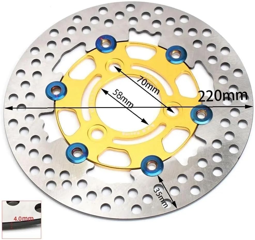 Tips before purchase:Hello, please make sure that this product matches the size of your motorcycle model. Thank you.Motorcycle Floating Disk Rotor Brake Caliper1. CNC Aluminum Electric Motorcycle 220mm Brake Disc 2. Size: Before You Purchase,Please Check You Motorcycle Size.3. Material: CNC Aluminum 4. 220mm Brake Disc With 3 Installation Hole,Each Installation Hole Distance is 70mm, inner diameter about 58mm.5. Suitable Models:For H&ONDA DIO 28/34/35/366. Color: Red/gray/black/gold/orangePure manual measurement, please allow the error 1-2mm