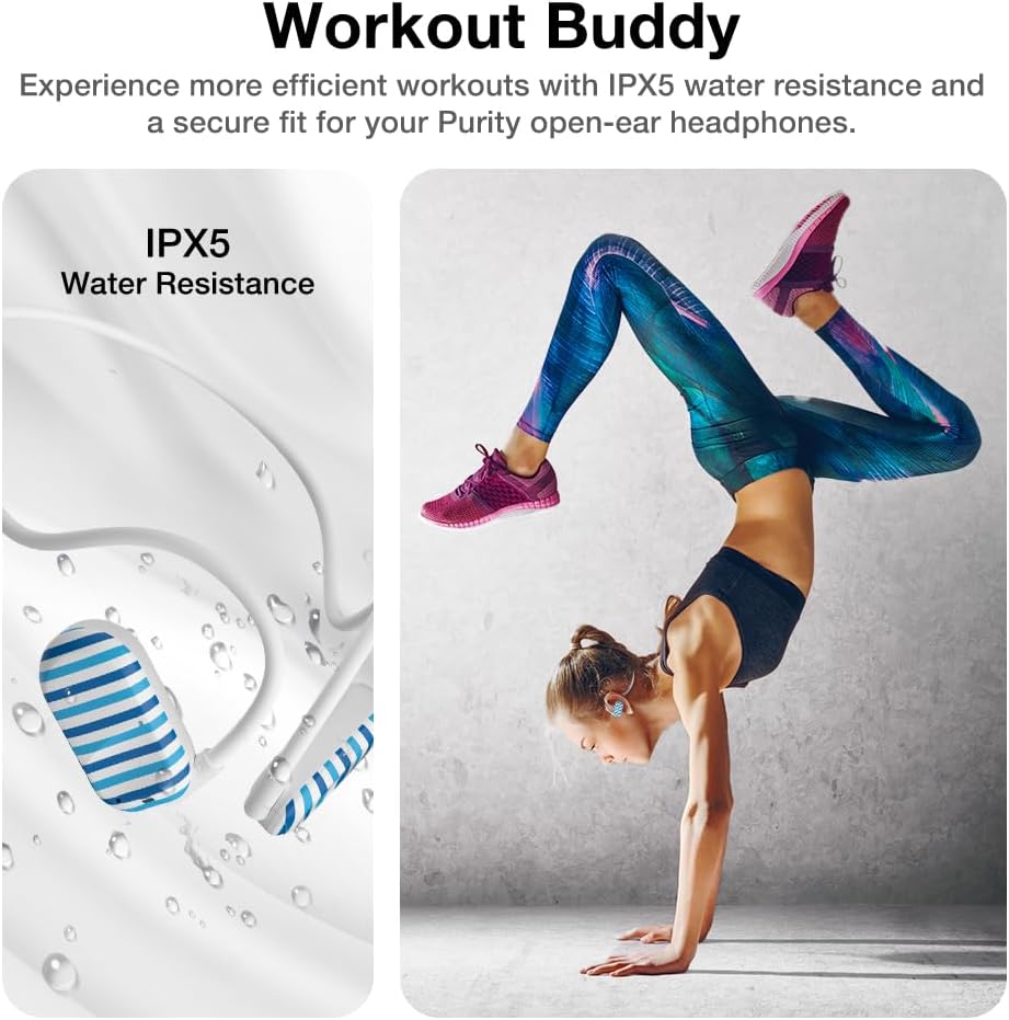 Introducing the Purity Open Ear Headphones with Air Conduction Technology, your solution for enjoying music all day with comfortable longtime wearing. Designed for active individuals and those who demand both audio quality and awareness of their surroundings, Purity Open Ear Headphones are your best fitness partner.