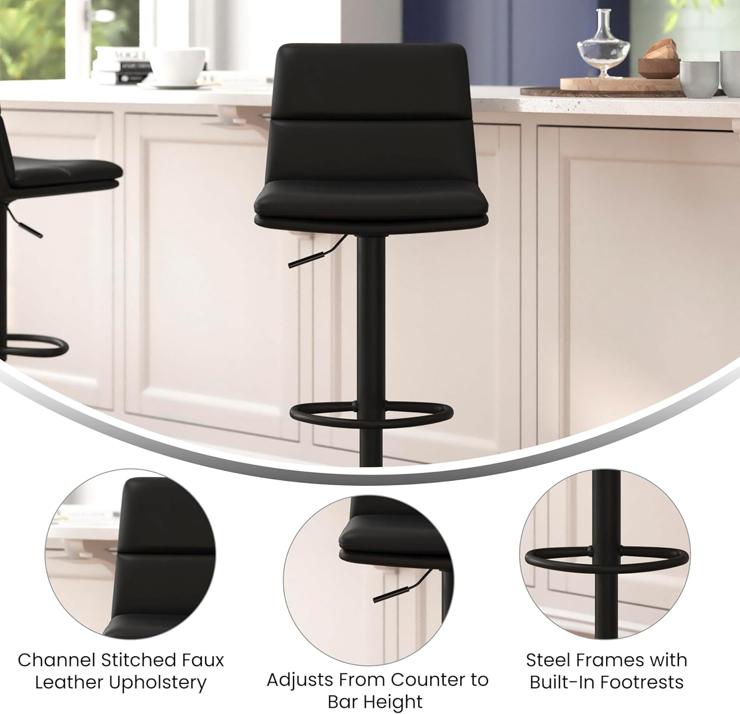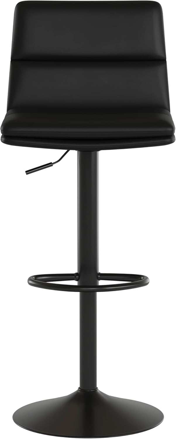 Modern luxury at a reasonable price makes this set of 2 adjustable height barstools an obvious choice to refresh the look of your dining space. Perfect for entertaining or everyday use, these stools boast attractive channel stitched faux leather upholstery atop an updated black steel pedestal base. A 360 swivel seat adjusts from counter to bar height while the integrated footrest not only complements the chair's modern design but also adds comfort.